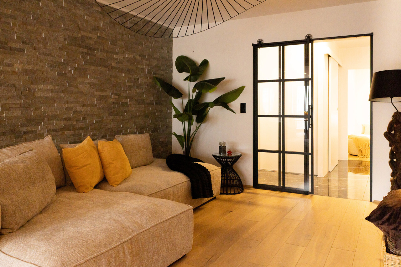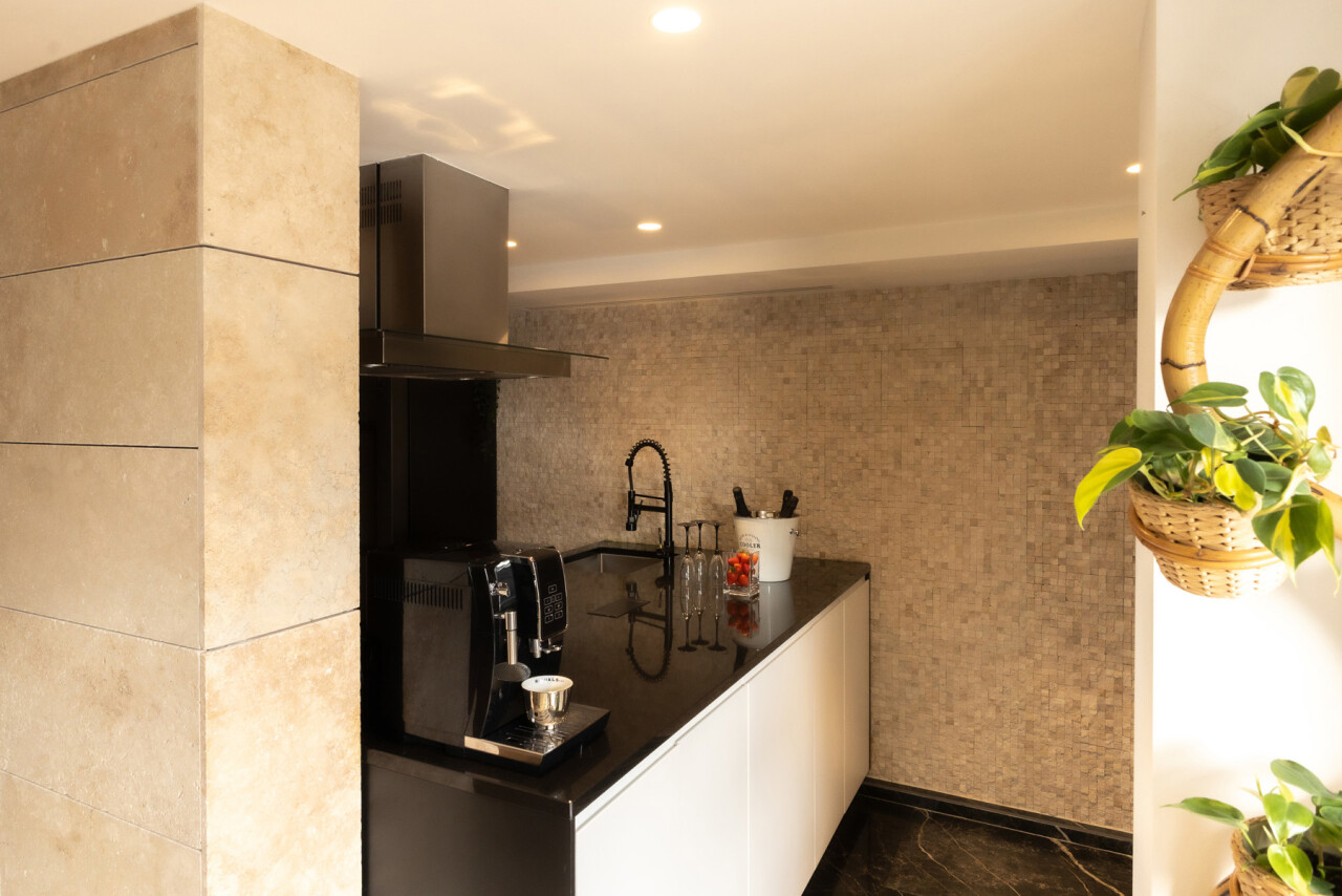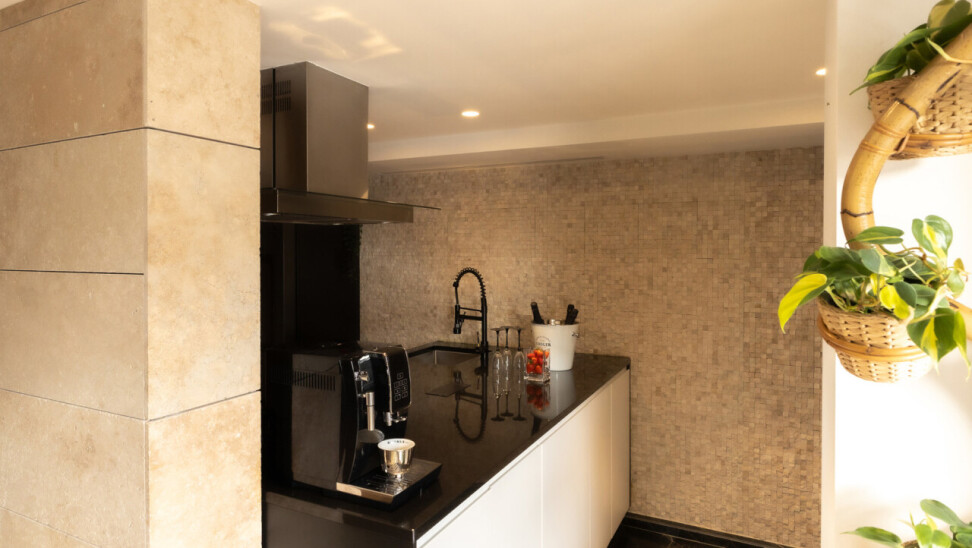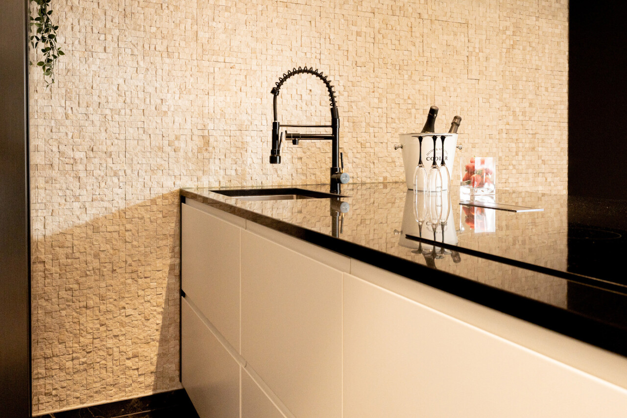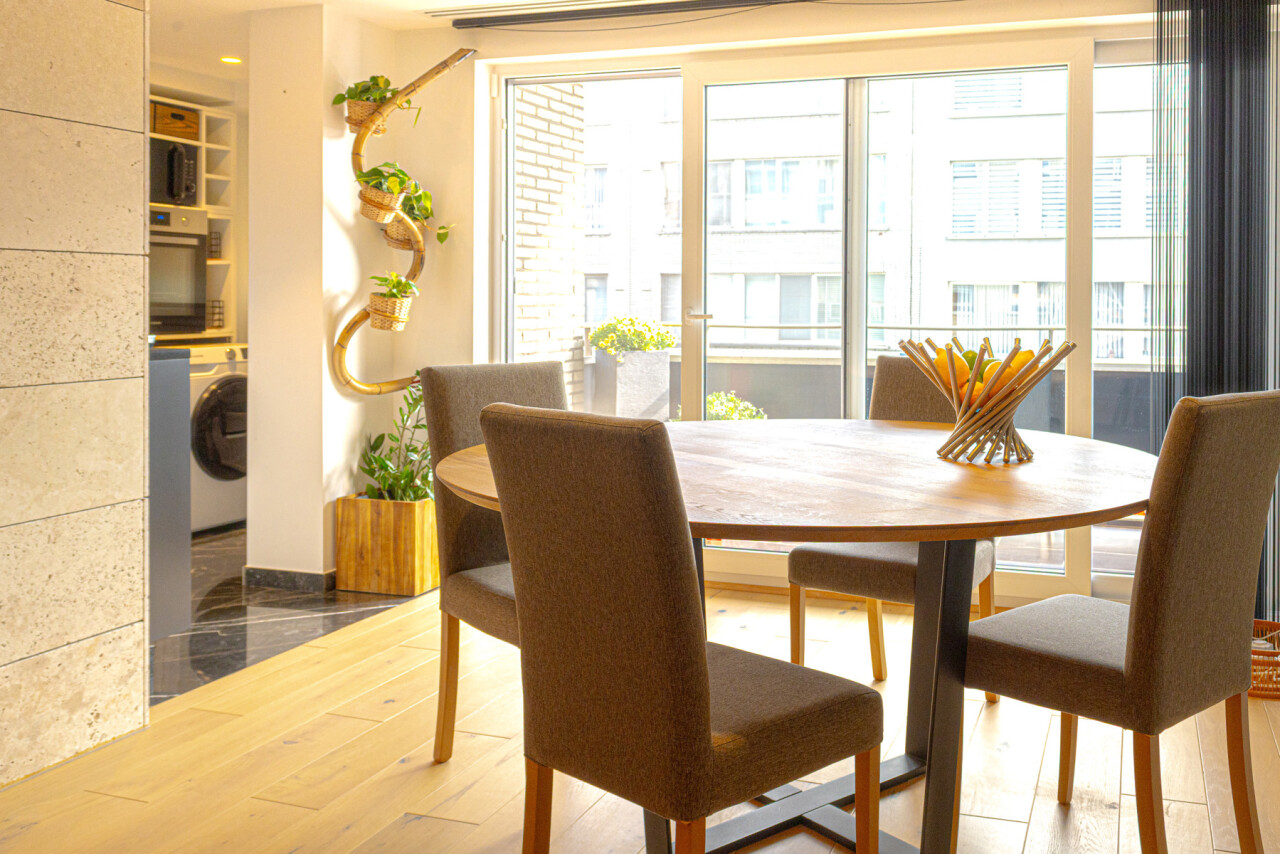 De lichtrijke leefruimte met grote schuiframen vormt het hart van het appartement en zorgt voor een naadloze verbinding met buiten. De open keuken met elegant kookeiland en granieten werkblad nodigt uit tot gezellige momenten en culinaire beleving.