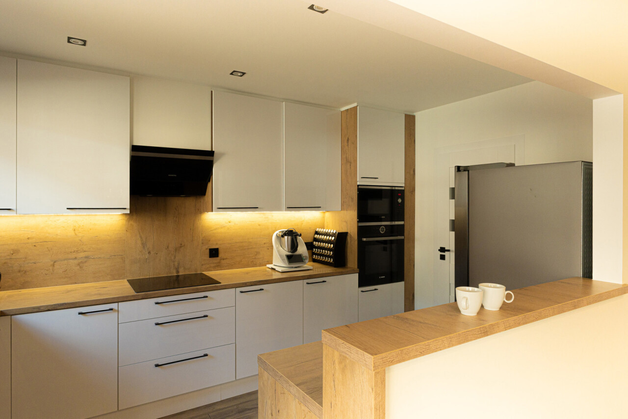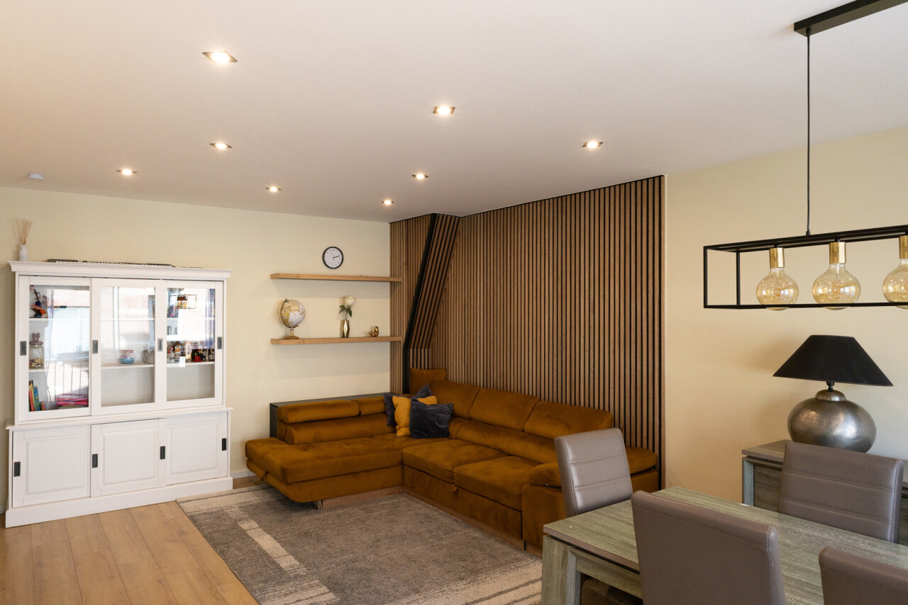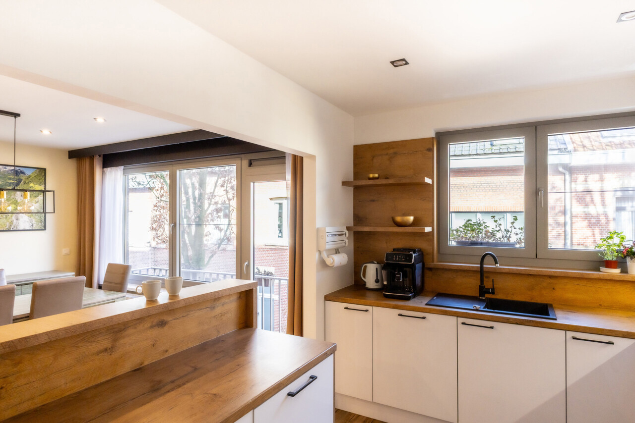 Via de ruime inkomhal met ingemaakte kasten betreedt u de gezellige leefruimte. De grote raampartijen zorgen voor een aangename lichtinval en creëren een open, warme sfeer. De volledig ingerichte keuken is praktisch opgevat en beschikt over voldoende kastruimte. Aansluitend vindt u een handige berging met de verwarmingsketel en aansluitingen voor wasmachine en droogkast.