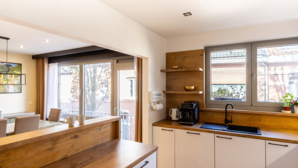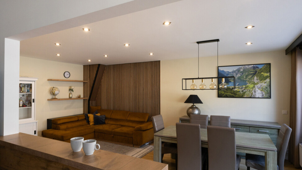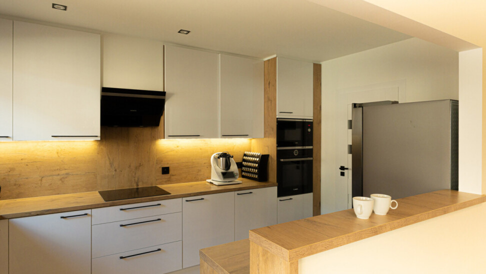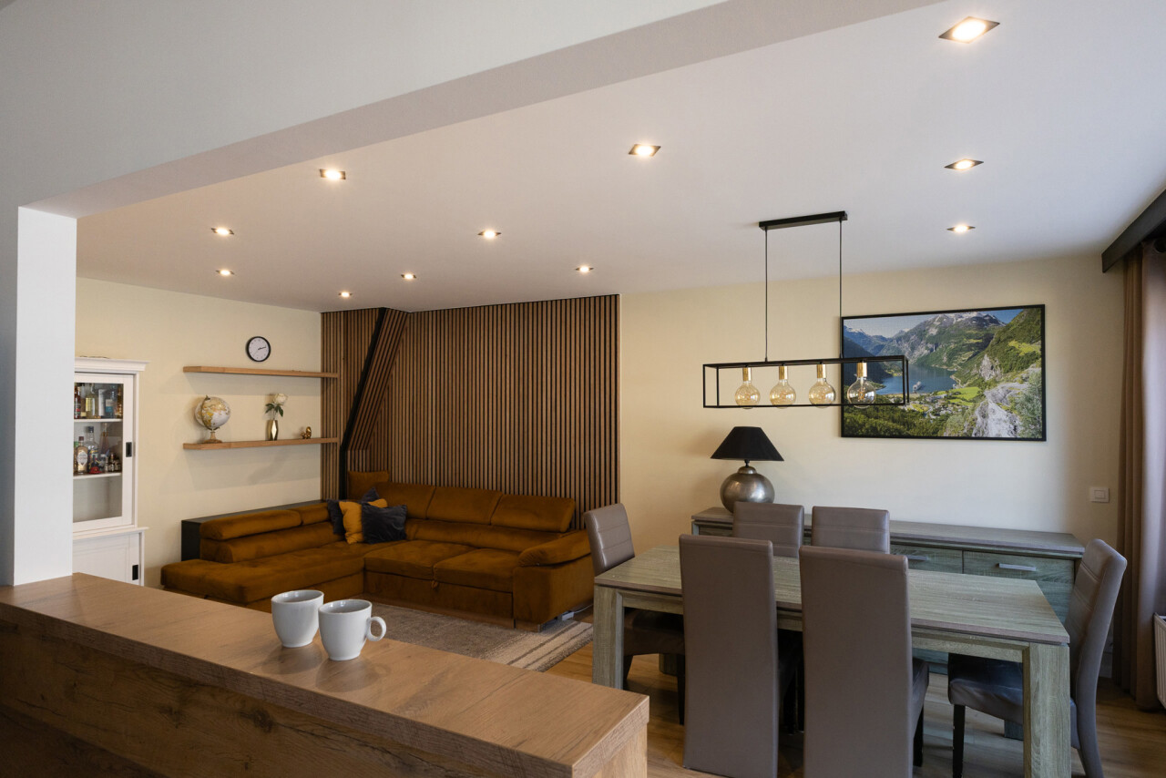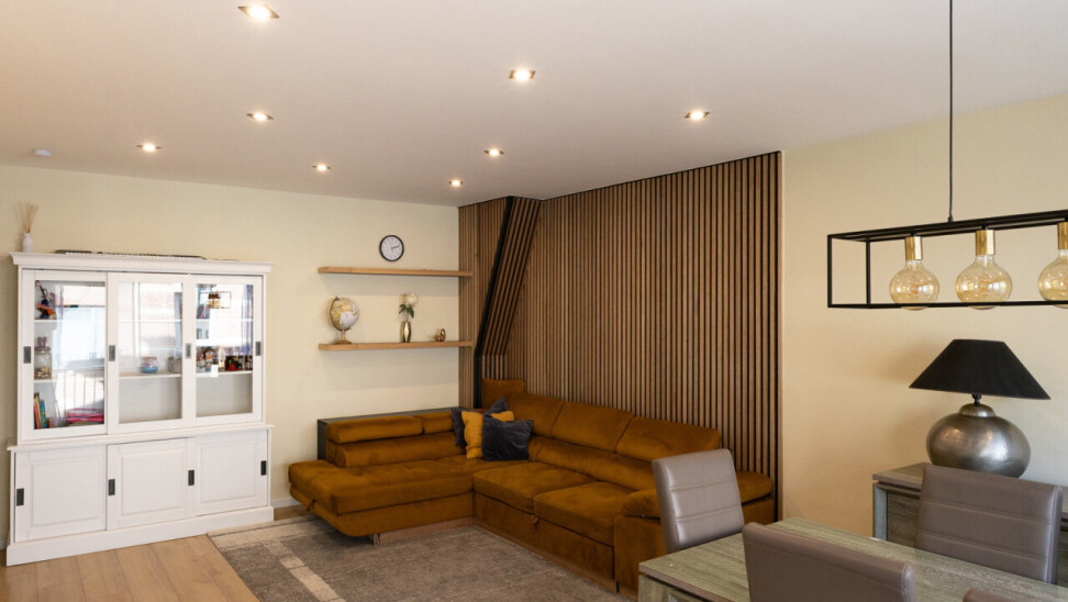 Via de ruime inkomhal met ingemaakte kasten betreedt u de gezellige leefruimte. De grote raampartijen zorgen voor een aangename lichtinval en creëren een open, warme sfeer. De volledig ingerichte keuken is praktisch opgevat en beschikt over voldoende kastruimte. Aansluitend vindt u een handige berging met de verwarmingsketel en aansluitingen voor wasmachine en droogkast.